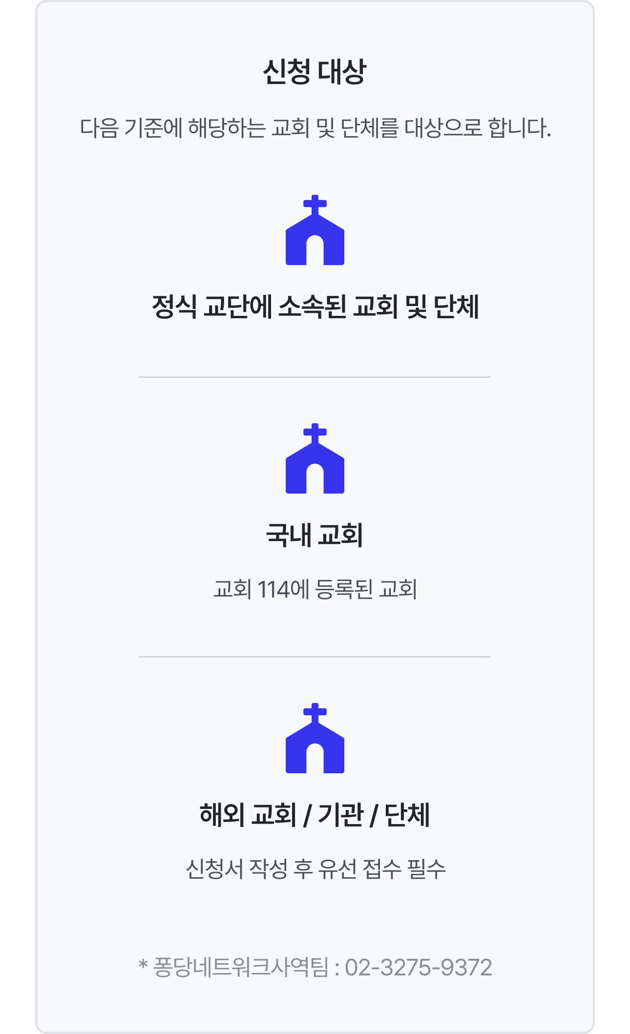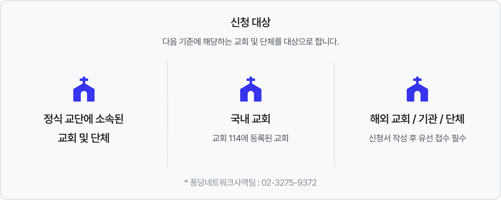 아래 기준에 해당하는 교회 및 단체를 대상으로 발급됩니다.
