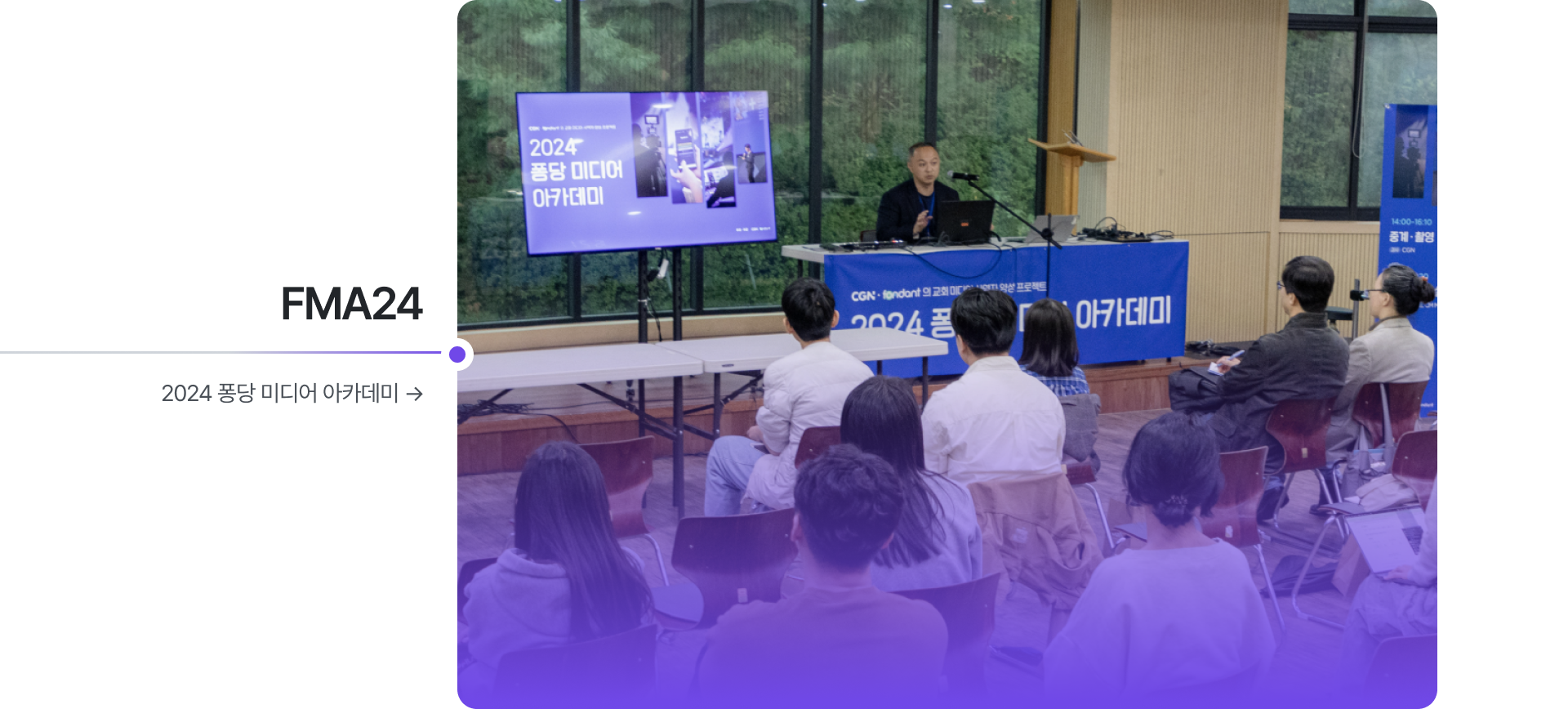 '교회 미디어 사역자 양성 프로젝트'를 슬로건으로 교회에 필요한 미디어 관련 모든 강의를 제공하는 전국 단위의 미디어 아카데미. AI와 퐁당 플랫폼 소개 및 교회 활용을 포함, 음향 / 영상 / 중계 / 촬영 / 자막 / 조명 / 디자인 등 교회에 꼭 필요한 강의들을 제공하여 보다 전문적인 미디어 사역자 양성에 기여하는 미디어 교육 프로젝트!