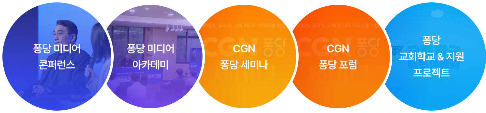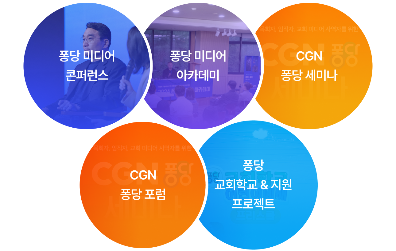 기반으로 미래교회 목회전략을 지역교회 리더십과 다루는 네트워킹 프로젝트 <CGN 퐁당 미디어 포럼>, 퐁당교회학교 어린이예배 콘텐츠로 교회학교 예배 회복과 운영을 돕는 <퐁당교회학교 & 지원 프로젝트> 등 교회와 목회 현장에 꼭 필요한 부분들을 지원하는 다양한 목적의 사역 프로젝트를 기획, 운영 중에 있습니다.